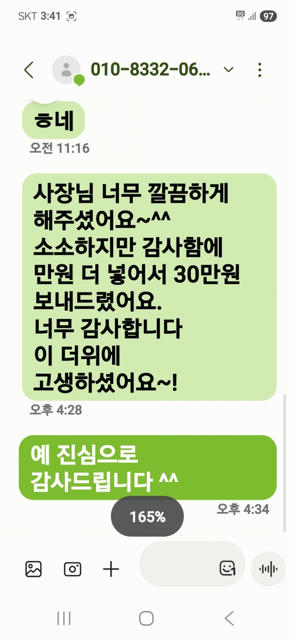 문자 후기 작성자 더홈케어구미 | 작성일25-08-31 12:04 관련링크 이전글 다음글 목록 글쓰기 본문 옥계휴먼시아 청소 후 받은 문자입니다 이전글 문자 후기 다음글 문자후기 댓글목록 등록된 댓글이 없습니다. 이전글 다음글 목록 글쓰기